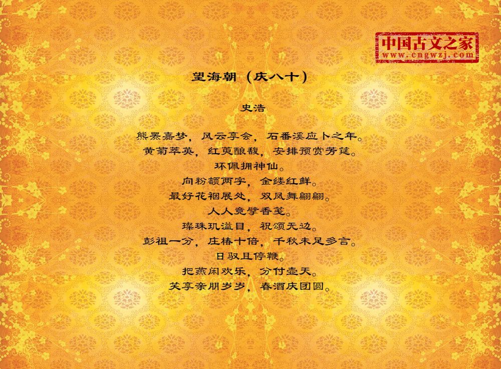 熊罴嘉梦,风云享会,石番溪应卜之年。黄菊萃英,红萸酿馥,安排预赏芳筵。环佩拥神仙。向粉额两字,金缕红鲜。最好花裀展处,双凤舞翩翩。人人竞擘香笺。璨珠玑溢目,祝颂无边。彭祖一分,庄椿十倍,千秋未足多言。日驭且停鞭。把燕闲欢乐,分付壶天。笑享亲朋岁岁,春酒庆团圆。