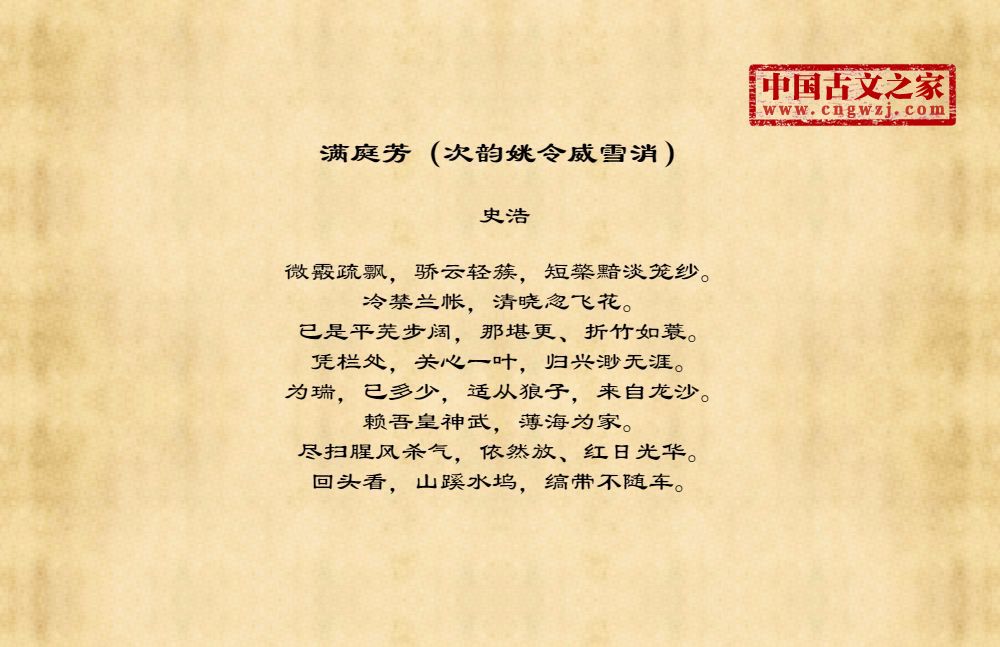 微霰疏飘,骄云轻簇,短檠黯淡笼纱。冷禁兰帐,清晓忽飞花。已是平芜步阔,那堪更、折竹如蓑。凭栏处,关心一叶,归兴渺无涯。为瑞,已多少,适从狼子,来自龙沙。赖吾皇神武,薄海为家。尽扫腥风杀气,依然放、红日光华。回头看,山蹊水坞,缟带不随车。