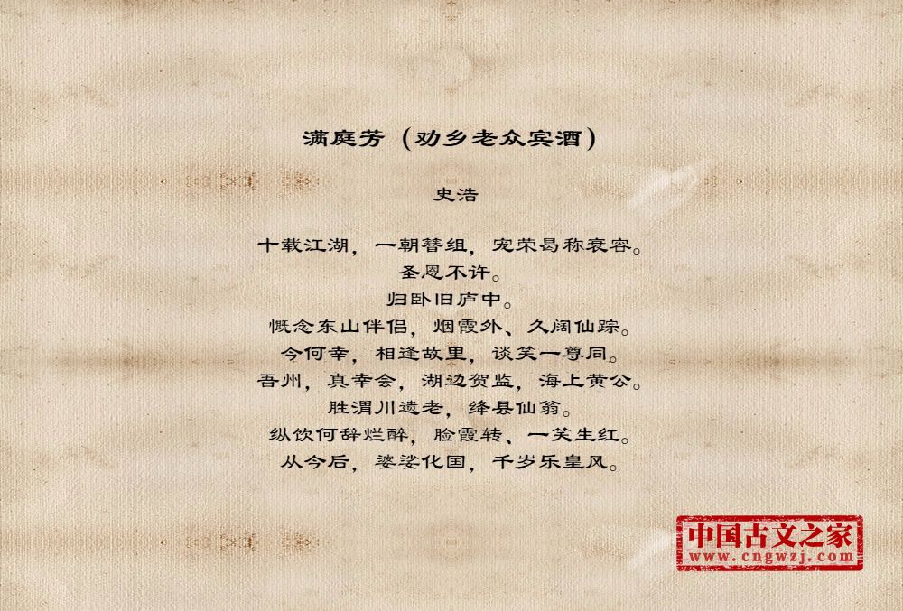 十载江湖,一朝簪组,宠荣曷称衰容。圣恩不许。归卧旧庐中。慨念东山伴侣,烟霞外、久阔仙踪。今何幸,相逢故里,谈笑一尊同。吾州,真幸会,湖边贺监,海上黄公。胜渭川遗老,绛县仙翁。纵饮何辞烂醉,脸霞转、一笑生红。从今后,婆娑化国,千岁乐皇风。
