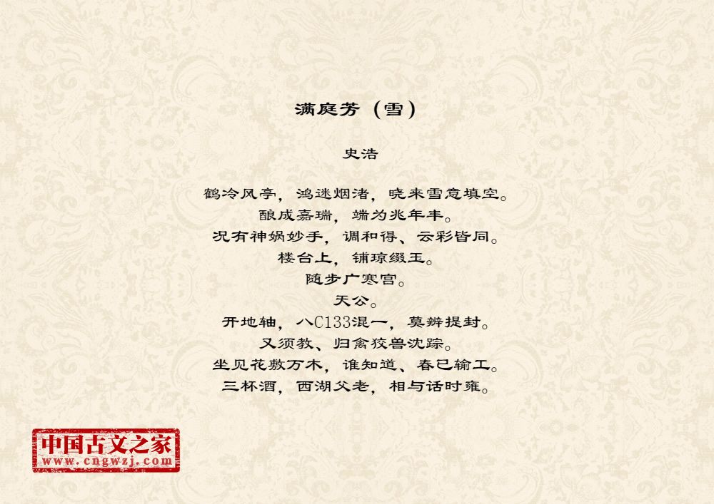 鹤冷风亭,鸿迷烟渚,晓来雪意填空。酿成嘉瑞,端为兆年丰。况有神娲妙手,调和得、云彩皆同。楼台上,铺琼缀玉。随步广寒宫。天公。开地轴,八C133混一,莫辨提封。又须教、归禽狡兽沈踪。坐见花敷万木,谁知道、春已输工。三杯酒,西湖父老,相与话时雍。