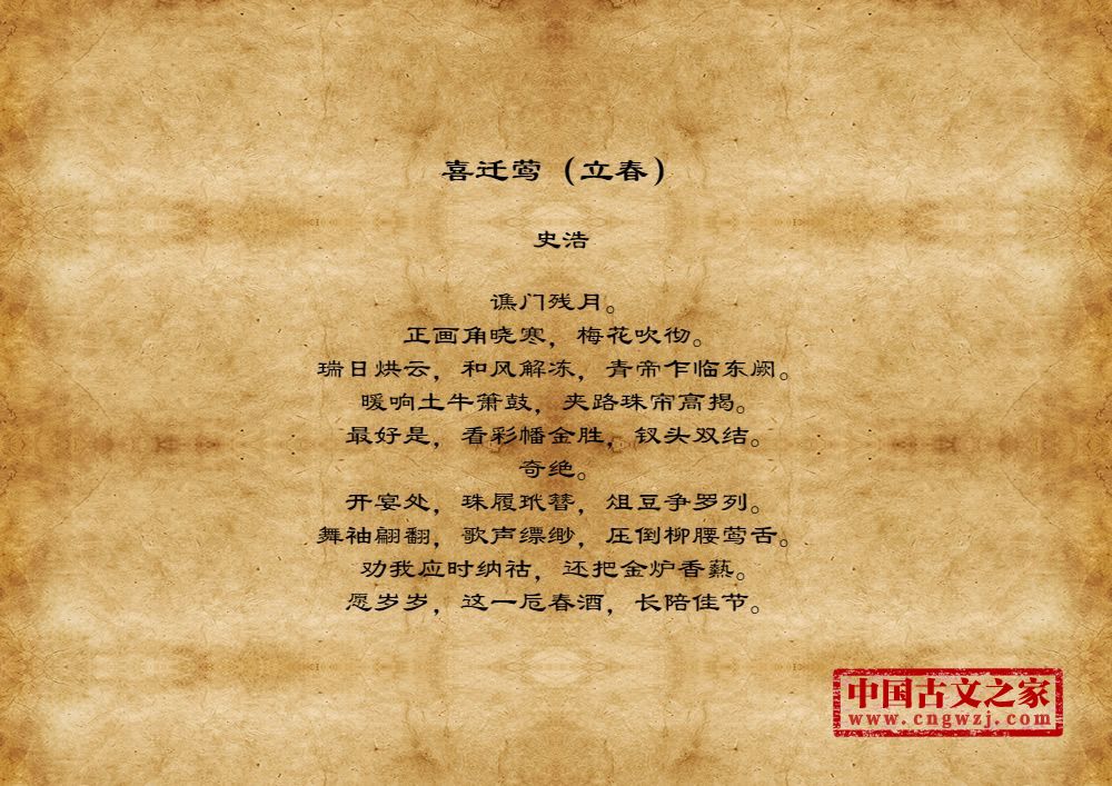 谯门残月。正画角晓寒,梅花吹彻。瑞日烘云,和风解冻,青帝乍临东阙。暖响土牛箫鼓,夹路珠帘高揭。最好是,看彩幡金胜,钗头双结。奇绝。开宴处,珠履玳簪,俎豆争罗列。舞袖翩翻,歌声缥缈,压倒柳腰莺舌。劝我应时纳祜,还把金炉香爇。愿岁岁,这一卮春酒,长陪佳节。