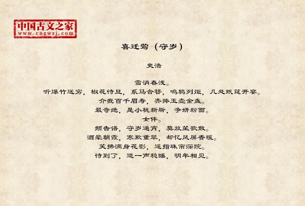 雪消春浅。听爆竹送穷,椒花待旦,系马合簪,鸣鸦列炬,几处玳筵开宴。介我百千眉寿,齐捧玉壶金盏。最奇绝,是小桃新坼,争妍粉面。女伴。频告语,守岁通宵,莫放笙歌散。酒晕朝霞,寒欺重翠,却忆凤屏香暖。笑拂满身花影,遥指珠帘深院。待到了,道一声稳睡,明年相见。