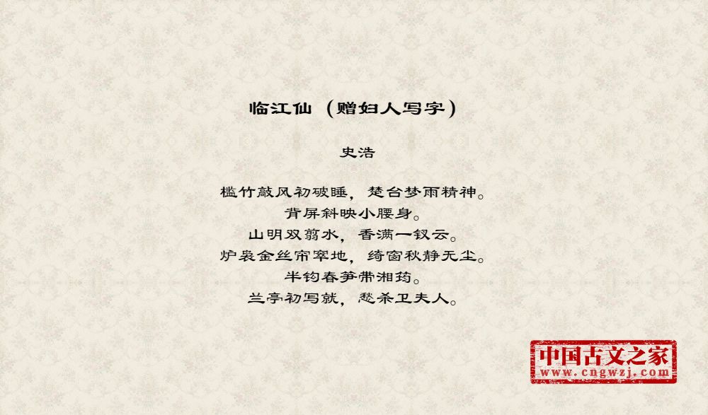 槛竹敲风初破睡,楚台梦雨精神。背屏斜映小腰身。山明双翦水,香满一钗云。炉袅金丝帘窣地,绮窗秋静无尘。半钩春笋带湘筠。兰亭初写就,愁杀卫夫人。