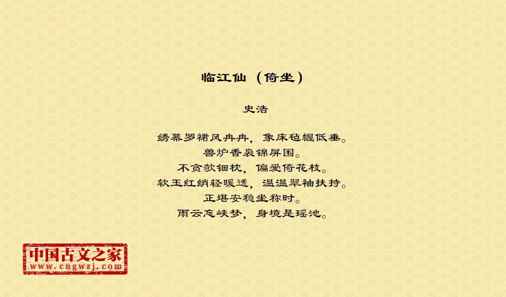 绣幕罗裙风冉冉,象床毡幄低垂。兽炉香袅锦屏围。不贪欹钿枕,偏爱倚花枝。软玉红绡轻暖透,温温翠袖扶持。正堪安稳坐称时。雨云忘峡梦,身境是瑶池。