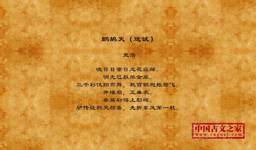 晓日日童日龙花露稀。明光已报敞金扉。三千彩仗翔鸾舞,数百银袍振鹭飞。开雉扇,正垂衣。奏篇初得上彤墀。胪传绕殿天颜喜,先折东风第一枝。