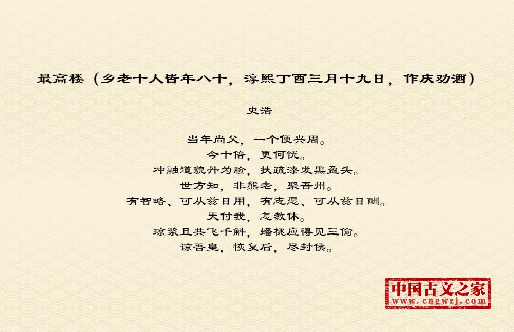 最高楼(乡老十人皆年八十,淳熙丁酉三月十九日,作庆劝酒)