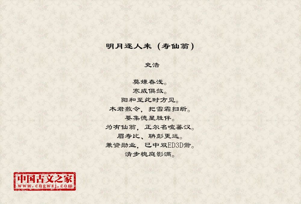 莫嫌春浅。寒威俱敛。阳和至此时方见。木君敷令,把雪霜扫断。要集德星胜伴。为有仙翁,正尔名喧蕃汉。眉寿比、聃彭更远。兼资勋业,已中双ED3D箭。清步槐庭影满。