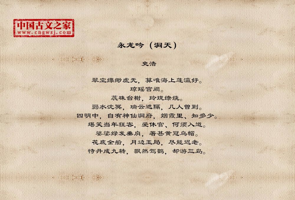 翠空缥缈虚无,算唯海上蓬瀛好。琼瑶宫阙。蕊珠台榭,玲珑缭绕。弱水沈冥,瑞云遮隔,几人曾到。四明中,自有神仙洞府,烟霞里、知多少。堪笑当年狂客,爱休官、何须入道。婆娑绿发垂肩,著甚黄冠乌帽。花底金船,月边玉局,尽能迟老。待丹成九转,飘然驾鹤,却游三岛。