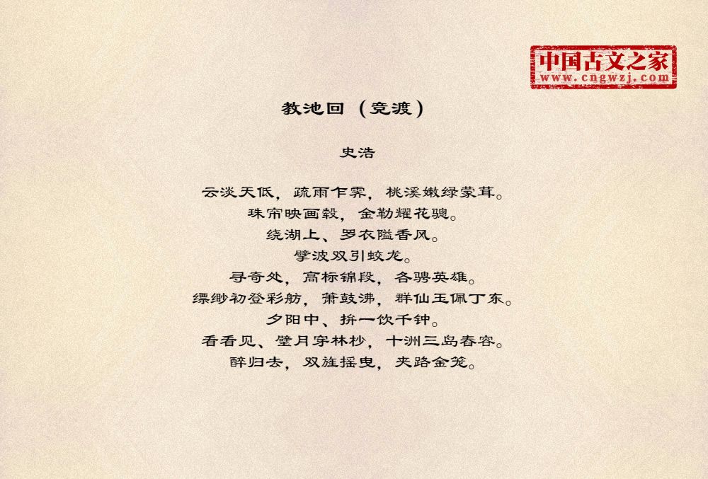 云淡天低,疏雨乍霁,桃溪嫩绿蒙茸。珠帘映画毂,金勒耀花骢。绕湖上、罗衣隘香风。擘波双引蛟龙。寻奇处,高标锦段,各骋英雄。缥缈初登彩舫,箫鼓沸,群仙玉佩丁东。夕阳中、拚一饮千钟。看看见、璧月穿林杪,十洲三岛舂容。醉归去,双旌摇曳,夹路金笼。