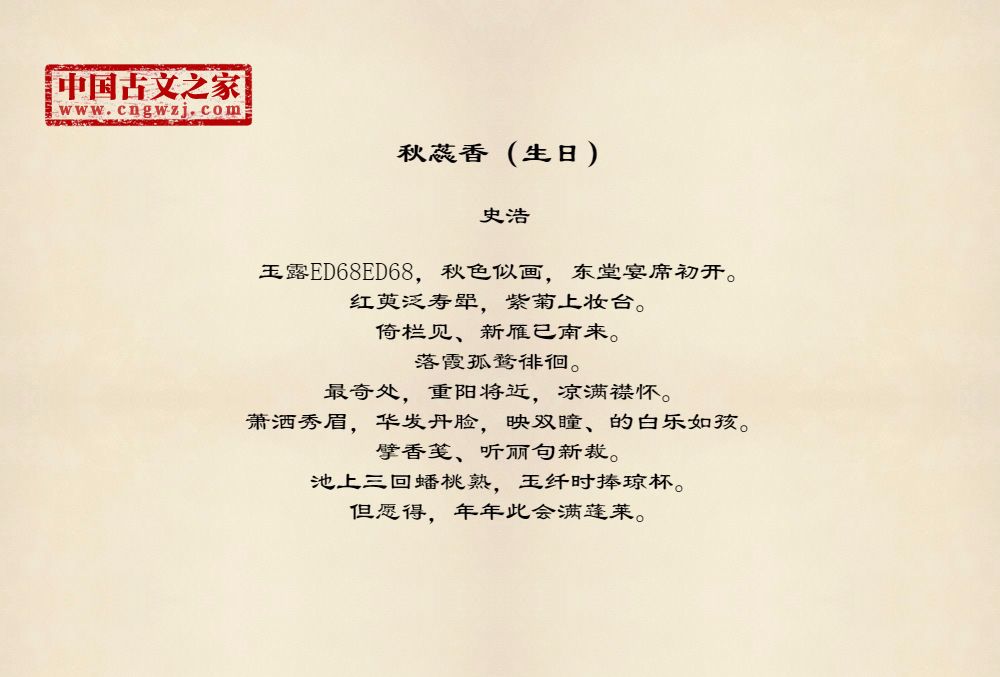 玉露ED68ED68,秋色似画,东堂宴席初开。红萸泛寿斝,紫菊上妆台。倚栏见、新雁已南来。落霞孤鹜徘徊。最奇处,重阳将近,凉满襟怀。萧洒秀眉,华发丹脸,映双瞳、的白乐如孩。擘香笺、听丽句新裁。池上三回蟠桃熟,玉纤时捧琼杯。但愿得,年年此会满蓬莱。