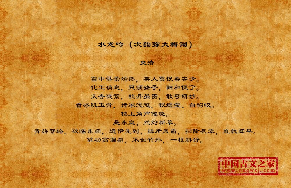 雪中蓓蕾嫣然,美人莫恨春容少。化工消息,只须些子,阳和便了。文杏徒繁,牡丹虽贵,敢夸妍妙。看冰肌玉骨,诗家漫道,银蟾莹、白驹皎。楼上角声催晓。是东皇、丝纶新草。青旂苍辂,欲临东阙,遣伊先到、排斥风霜,扫除氛雾,直教闻早。算功高调鼎,不如竹外,一枝斜好。