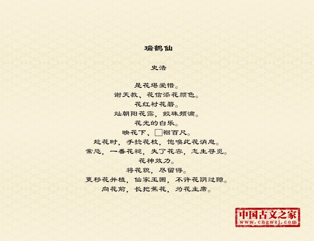 是花堪爱惜。谢天教、花信添花颜色。花红衬花碧。灿朝阳花露,鲛珠频滴。花光的白乐。映花下、□裀百尺。趁花时,手捻花枝,饱嗅此花消息。常恐,一番花褪,失了花容,怎生寻觅。花神效力。将花貌,尽留得。更移花并植,仙家玉圃,不许花阴过隙。向花前,长把蕉花,为花主席。