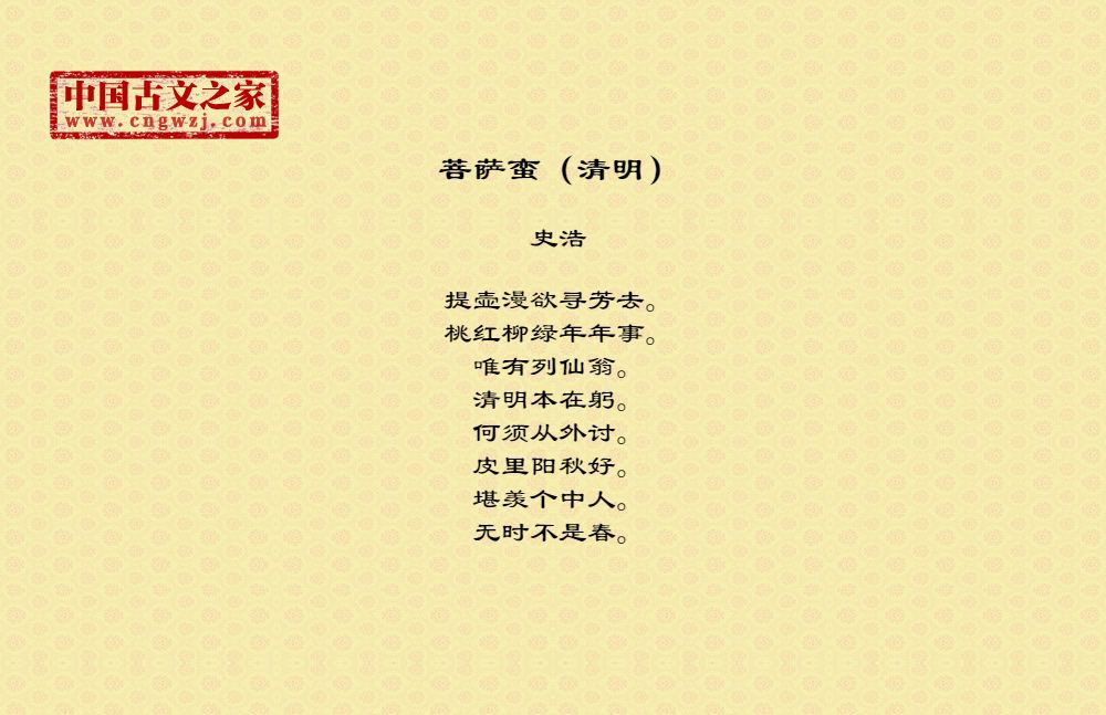 提壶漫欲寻芳去。桃红柳绿年年事。唯有列仙翁。清明本在躬。何须从外讨。皮里阳秋好。堪羡个中人。无时不是春。