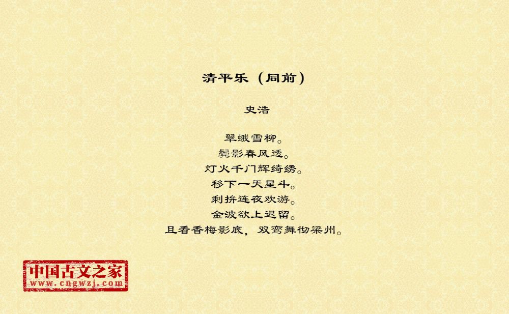 翠蛾雪柳。鬓影春风透。灯火千门辉绮绣。移下一天星斗。剩拚连夜欢游。金波欲上迟留。且看香梅影底,双鸾舞彻梁州。