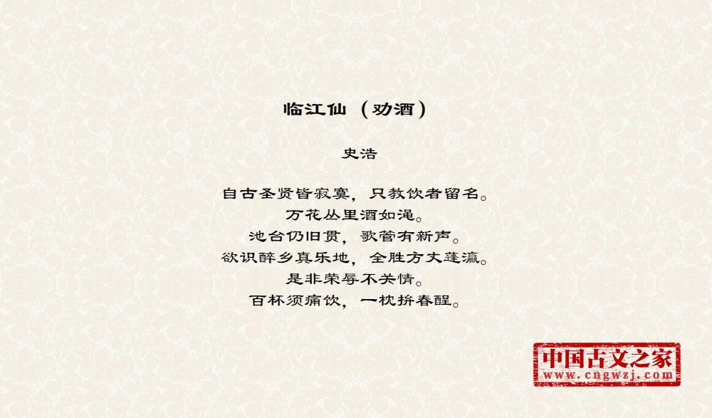 自古圣贤皆寂寞,只教饮者留名。万花丛里酒如渑。池台仍旧贯,歌管有新声。欲识醉乡真乐地,全胜方丈蓬瀛。是非荣辱不关情。百杯须痛饮,一枕拚春酲。