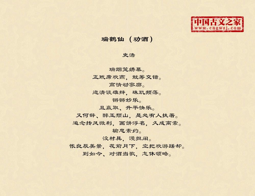 瑞烟笼绣幕。正玳席欢燕,觥筹交错。高情动寥廓。恣清谈雄辩,珠玑频落。锵锵妙乐。且赢取、升平快乐。又何辞、醉玉颓山,是处有人扶著。追念抟风微利,画饼浮名,久成离索。输忠素约。没材具,漫担阁。怅良辰美景,花前月下,空把欢游蹉却。到如今、对酒当歌,怎休领略。