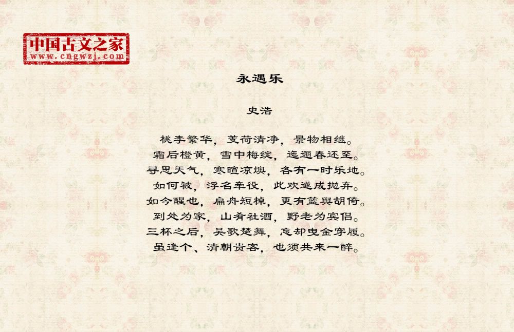 桃李繁华,芰荷清净,景物相继。霜后橙黄,雪中梅绽,迤逦春还至。寻思天气,寒暄凉燠,各有一时乐地。如何被,浮名牵役,此欢遂成抛弃。如今醒也,扁舟短棹,更有篮舆胡倚。到处为家,山肴社酒,野老为宾侣。三杯之后,吴歌楚舞,忘却曳金穿履。虽逢个、清朝贵客,也须共来一醉。