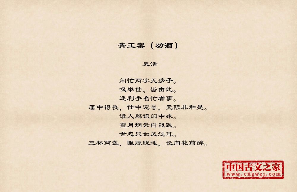 闲忙两字无多子。叹举世、皆由此。逐利争名忙者事。廛中得丧,仕中宠辱,无限非和是。谁人解识闲中味。雪月烟云自能致。世态只如风过耳。三杯两盏,眼朦胧地,长向花前醉。