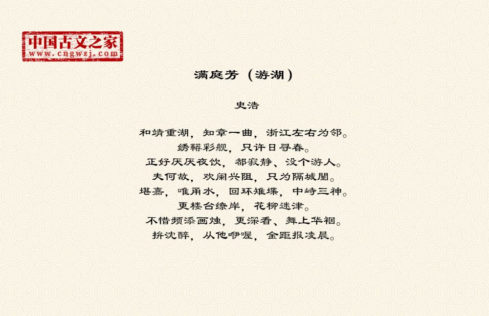 和靖重湖,知章一曲,浙江左右为邻。绣鞯彩舰,只许日寻春。正好厌厌夜饮,都寂静、没个游人。夫何故,欢阑兴阻,只为隔城闉。堪嘉,唯甬水,回环雉堞,中峙三神。更楼台缭岸,花柳迷津。不惜频添画烛,更深看、舞上华裀。拚沈醉,从他咿喔,金距报凌晨。