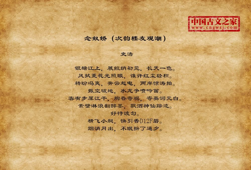 银塘江上,展鲛绡初见,长天一色。风拭菱花光照眼,谁许红尘轻积。转盼冯夷,奔云起电,两岸惊涛拍。振空破地,水龙争喷吟笛。客有步屟江干,胸吞奇观,寄英词元白。素壁淋浪翻醉墨,飘洒神仙踪迹。好待波匀。横飞小艇,快引香D12F碧。烟消月出,不眠拚了通夕。