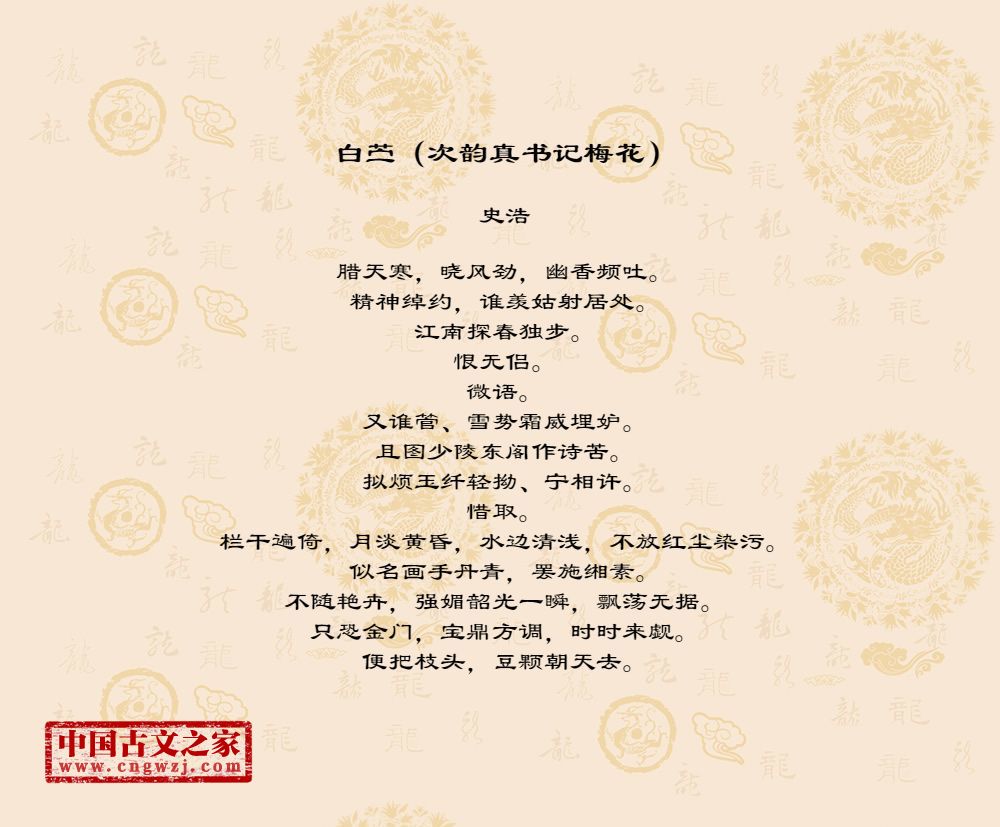 腊天寒,晓风劲,幽香频吐。精神绰约,谁羡姑射居处。江南探春独步。恨无侣。微语。又谁管、雪势霜威埋妒。且图少陵东阁作诗苦。拟烦玉纤轻拗、宁相许。惜取。栏干遍倚,月淡黄昏,水边清浅,不放红尘染污。似名画手丹青,罢施缃素。不随艳卉,强媚韶光一瞬,飘荡无据。只恐金门,宝鼎方调,时时来觑。便把枝头,豆颗朝天去。