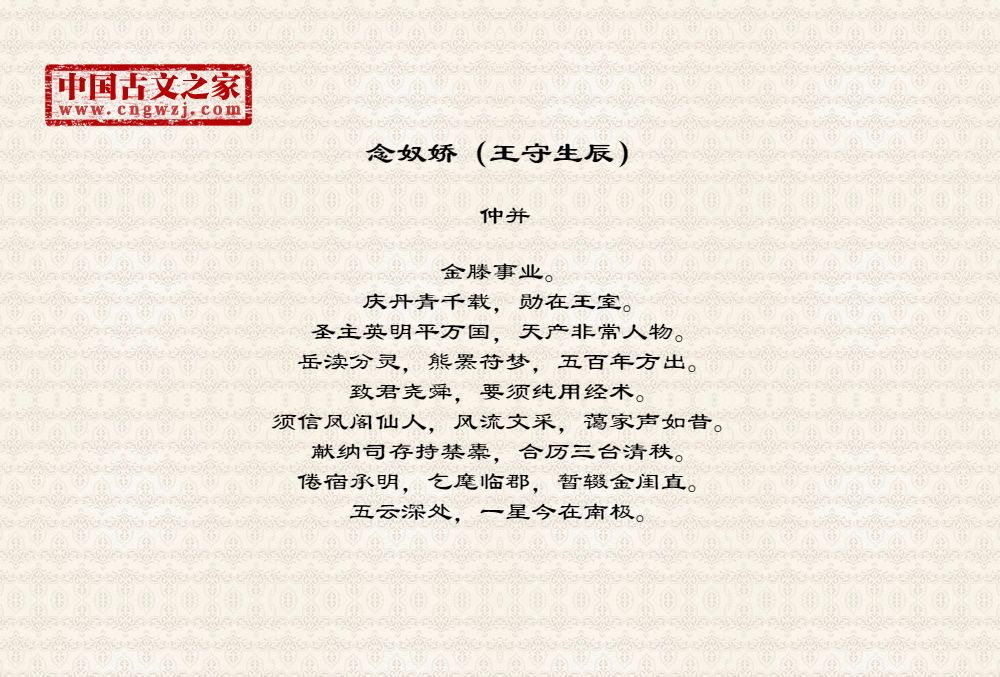 金滕事业。庆丹青千载,勋在王室。圣主英明平万国,天产非常人物。岳渎分灵,熊罴符梦,五百年方出。致君尧舜,要须纯用经术。须信凤阁仙人,风流文采,蔼家声如昔。献纳司存持禁橐,合历三台清秩。倦宿承明,乞麾临郡,暂辍金闺直。五云深处,一星今在南极。