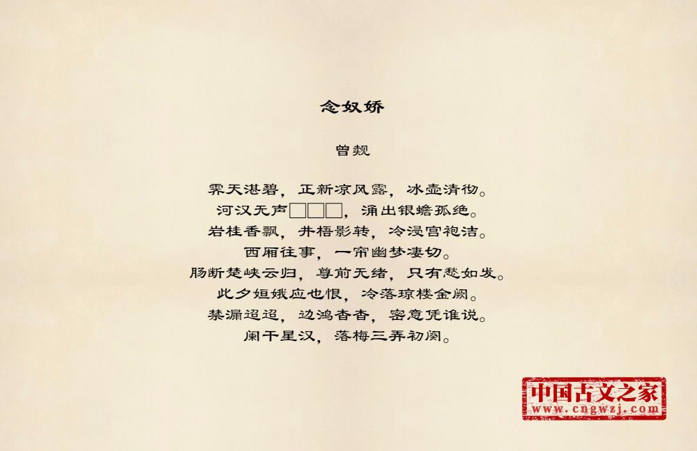 霁天湛碧,正新凉风露,冰壶清彻。河汉无声□□□,涌出银蟾孤绝。岩桂香飘,井梧影转,冷浸宫袍洁。西厢往事,一帘幽梦凄切。肠断楚峡云归,尊前无绪,只有愁如发。此夕姮娥应也恨,冷落琼楼金阙。禁漏迢迢,边鸿杳杳,密意凭谁说。阑干星汉,落梅三弄初阕。