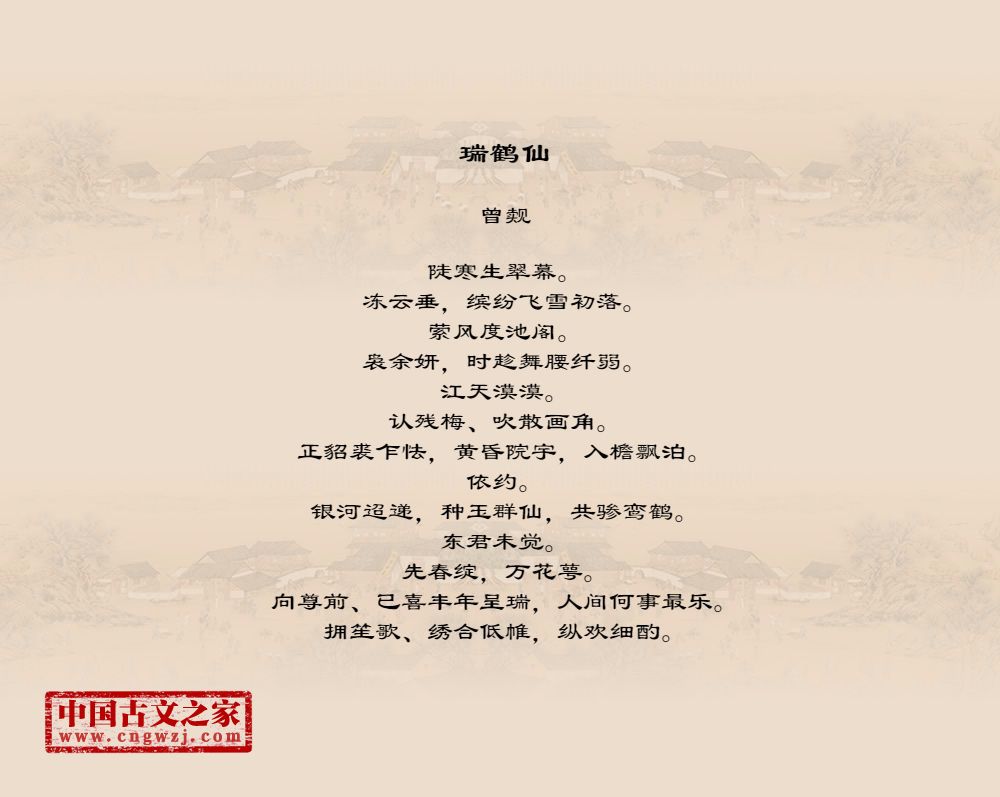 陡寒生翠幕。冻云垂,缤纷飞雪初落。萦风度池阁。袅余妍,时趁舞腰纤弱。江天漠漠。认残梅、吹散画角。正貂裘乍怯,黄昏院宇,入檐飘泊。依约。银河迢递,种玉群仙,共骖鸾鹤。东君未觉。先春绽,万花萼。向尊前、已喜丰年呈瑞,人间何事最乐。拥笙歌、绣合低帷,纵欢细酌。