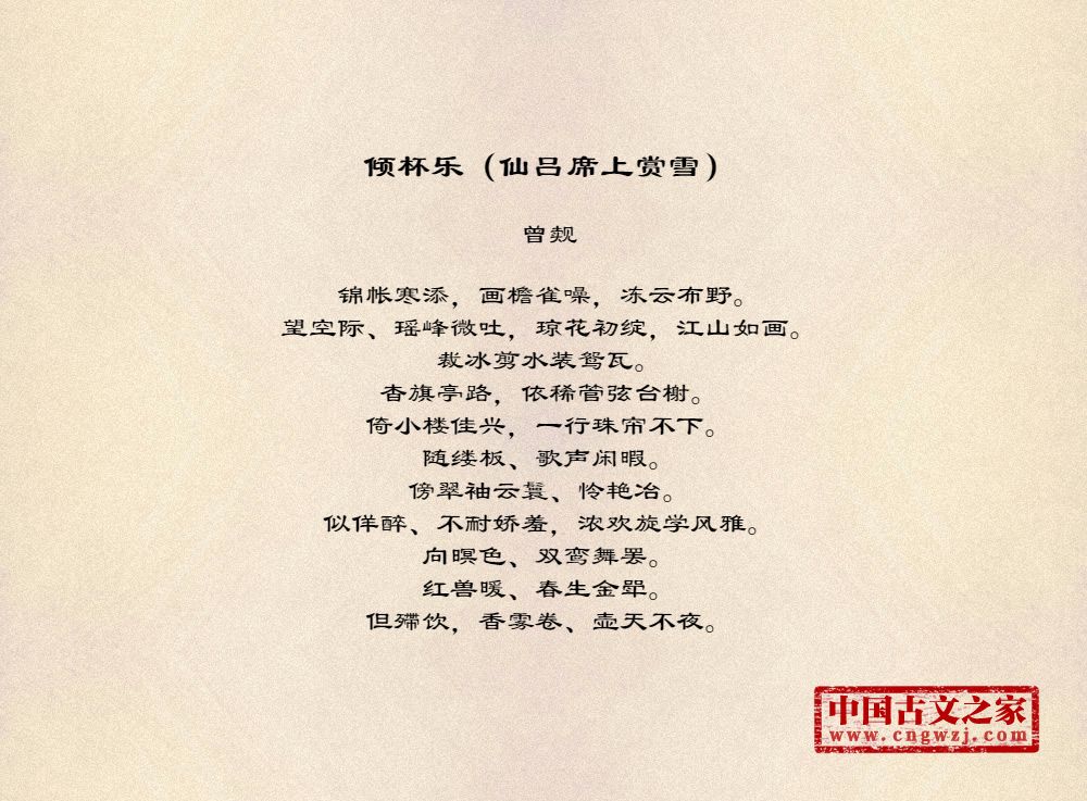 锦帐寒添,画檐雀噪,冻云布野。望空际、瑶峰微吐,琼花初绽,江山如画。裁冰剪水装鸳瓦。杳旗亭路,依稀管弦台榭。倚小楼佳兴,一行珠帘不下。随缕板、歌声闲暇。傍翠袖云鬟、怜艳冶。似佯醉、不耐娇羞,浓欢旋学风雅。向暝色、双鸾舞罢。红兽暖、春生金斝。但殢饮,香雾卷、壶天不夜。