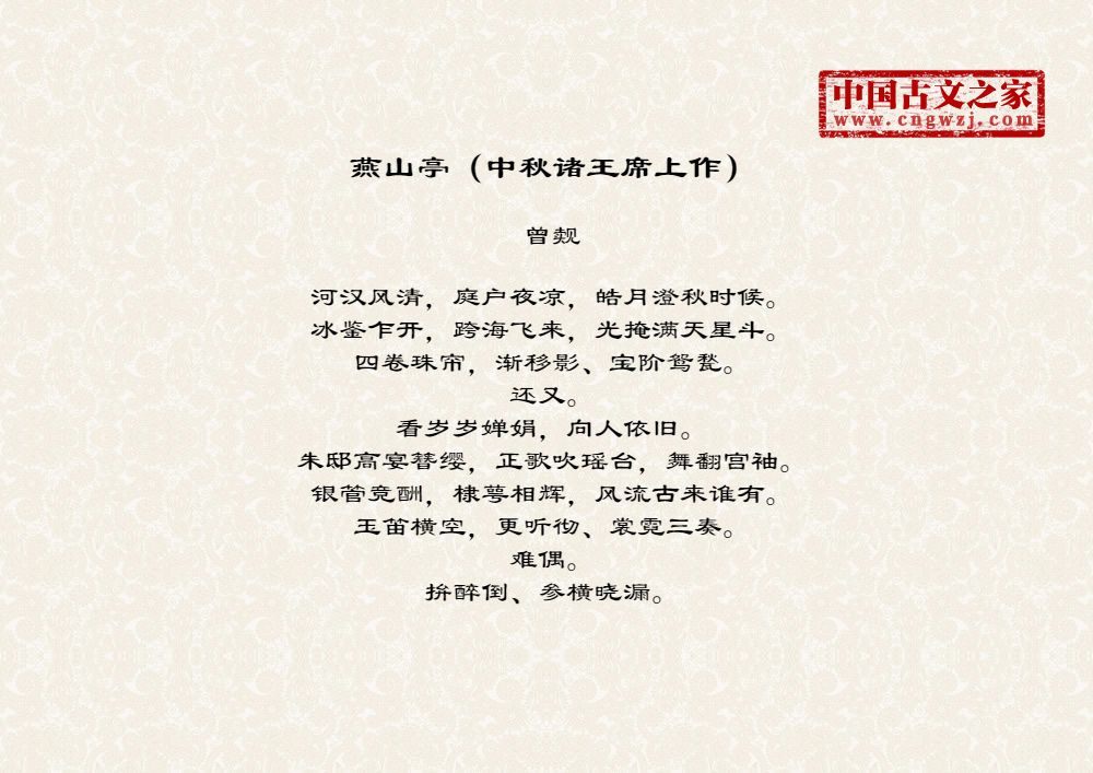 河汉风清,庭户夜凉,皓月澄秋时候。冰鉴乍开,跨海飞来,光掩满天星斗。四卷珠帘,渐移影、宝阶鸳甃。还又。看岁岁婵娟,向人依旧。朱邸高宴簪缨,正歌吹瑶台,舞翻宫袖。银管竞酬,棣萼相辉,风流古来谁有。玉笛横空,更听彻、裳霓三奏。难偶。拚醉倒、参横晓漏。