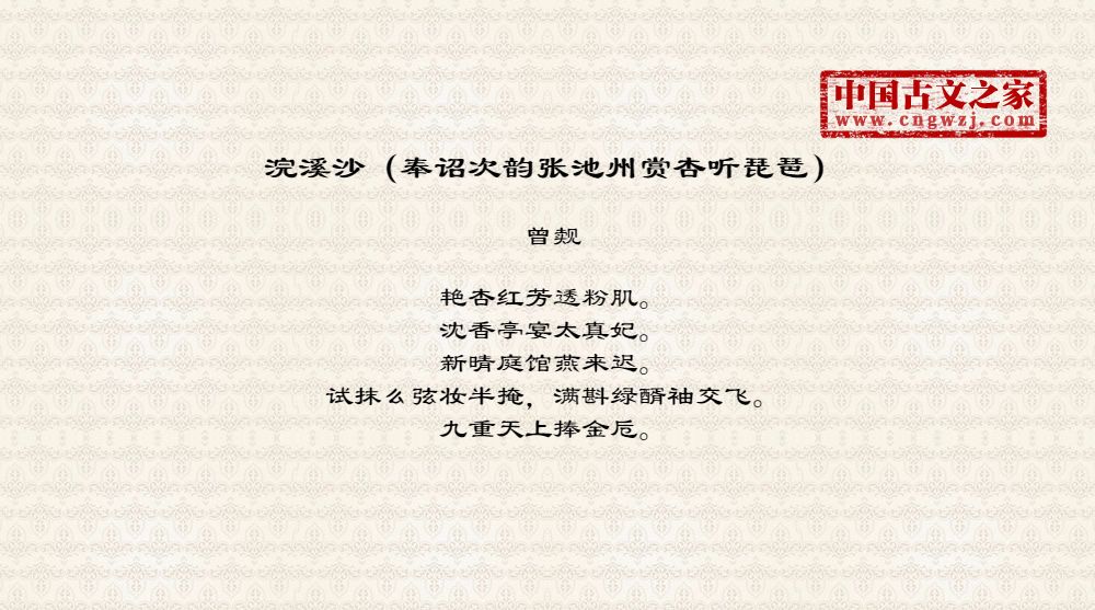 《浣溪沙(奉诏次韵张池州赏杏听琵琶)》的原文打印版(曾觌)