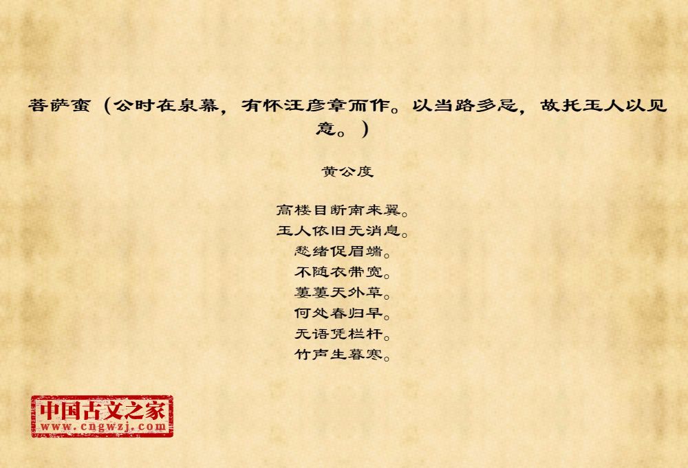 《菩萨蛮(公时在泉幕,有怀汪彦章而作。以当路多忌,故托玉人以见意。)》的原文打印版(黄公度)