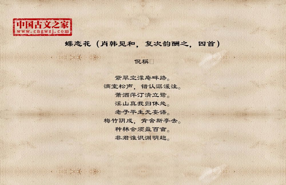 《蝶恋花(肖韩见和,复次韵酬之,四首)》由倪稱创作