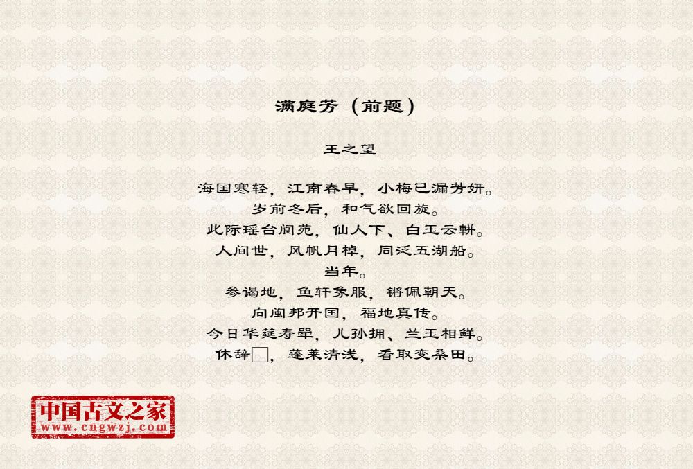 海国寒轻,江南春早,小梅已漏芳妍。岁前冬后,和气欲回旋。此际瑶台阆苑,仙人下、白玉云軿。人间世,风帆月棹,同泛五湖船。当年。参谒地,鱼轩象服,锵佩朝天。向闽邦开国,福地真传。今日华筵寿斝,儿孙拥、兰玉相鲜。休辞□,蓬莱清浅,看取变桑田。