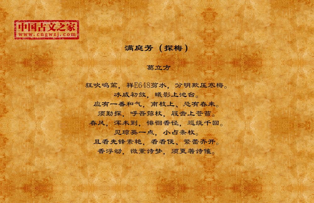 狂吹鸣篱,祥E648剪水,分明欺压寒梅。冰威初敛,曦影上池台。应有一番和气,南枝上、恐有春来。须勤探,呼吾筇杖,屐齿上苍苔。春风,浑未到,徘徊香径,巡绕千回。见琼英一点,小占条枚。且看先锋素艳,看看便、繁蕾齐开。香浮动,微薰诗梦,须更著诗催。