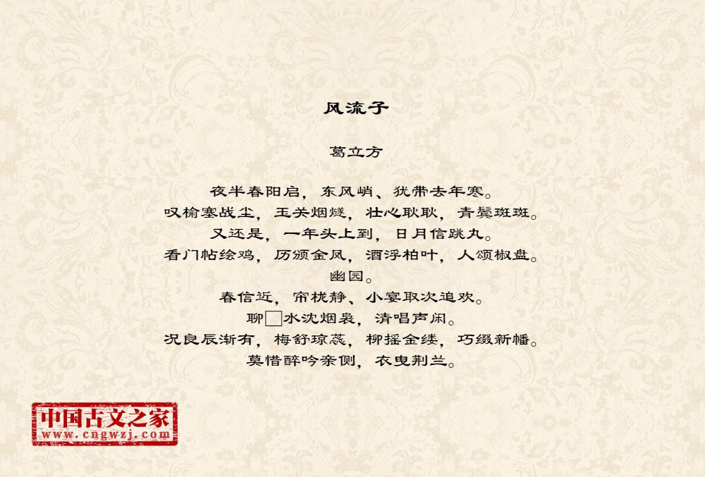 夜半春阳启,东风峭、犹带去年寒。叹榆塞战尘,玉关烟燧,壮心耿耿,青鬓斑斑。又还是,一年头上到,日月信跳丸。看门帖绘鸡,历颁金凤,酒浮柏叶,人颂椒盘。幽园。春信近,帘栊静、小宴取次追欢。聊□水沈烟袅,清唱声闲。况良辰渐有,梅舒琼蕊,柳摇金缕,巧缀新幡。莫惜醉吟亲侧,衣曳荆兰。