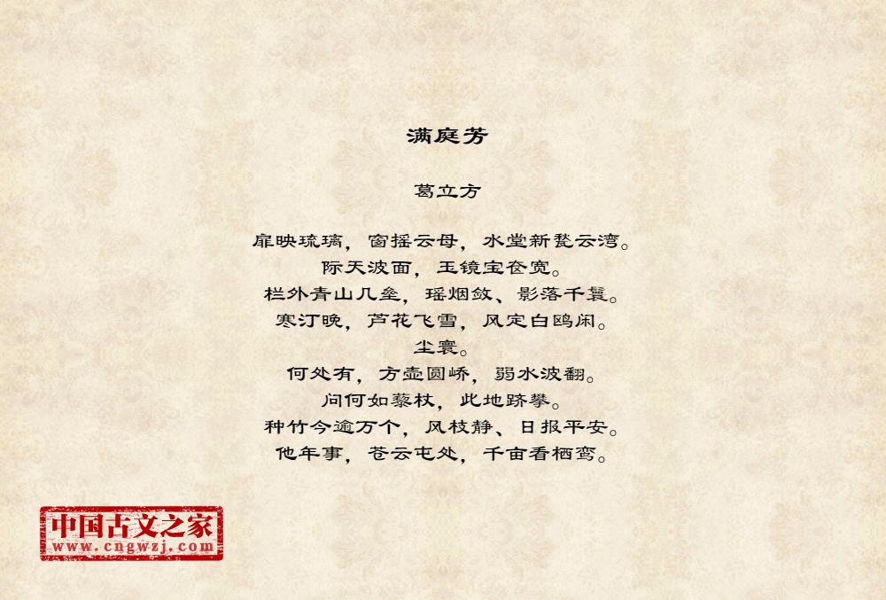 扉映琉璃,窗摇云母,水堂新甃云湾。际天波面,玉镜宝奁宽。栏外青山几垒,瑶烟敛、影落千鬟。寒汀晚,芦花飞雪,风定白鸥闲。尘寰。何处有,方壶圆峤,弱水波翻。问何如藜杖,此地跻攀。种竹今逾万个,风枝静、日报平安。他年事,苍云屯处,千亩看栖鸾。