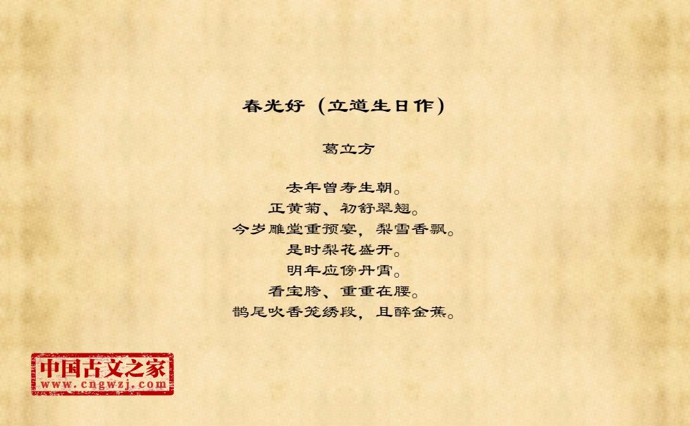 去年曾寿生朝。正黄菊、初舒翠翘。今岁雕堂重预宴,梨雪香飘。是时梨花盛开。明年应傍丹霄。看宝胯、重重在腰。鹊尾吹香笼绣段,且醉金蕉。