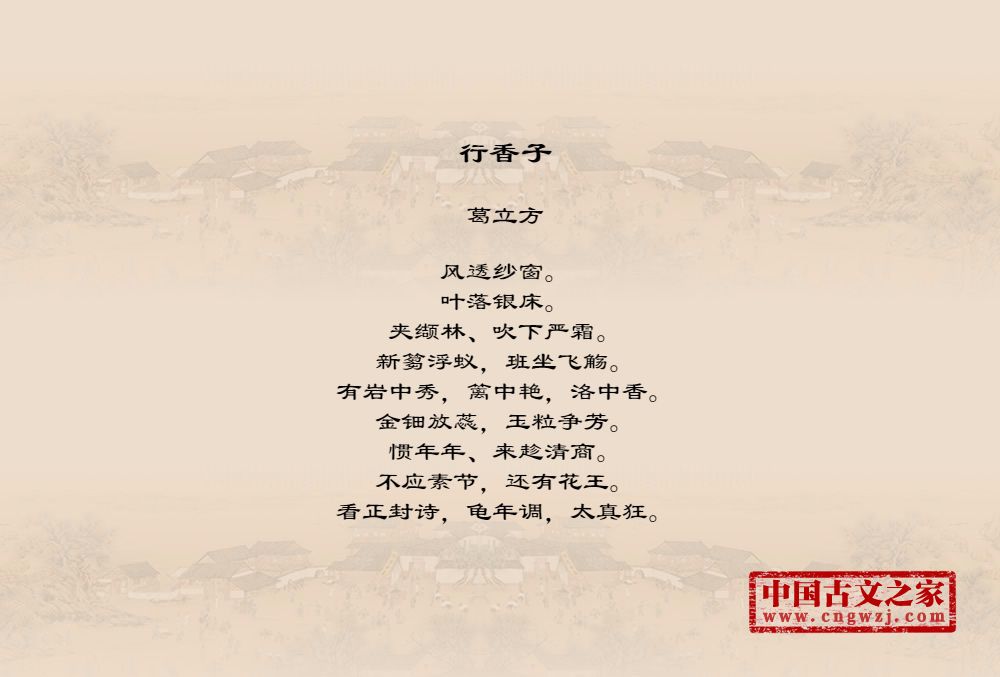 风透纱窗。叶落银床。夹缬林、吹下严霜。新篘浮蚁,班坐飞觞。有岩中秀,篱中艳,洛中香。金钿放蕊,玉粒争芳。惯年年、来趁清商。不应素节,还有花王。看正封诗,龟年调,太真狂。