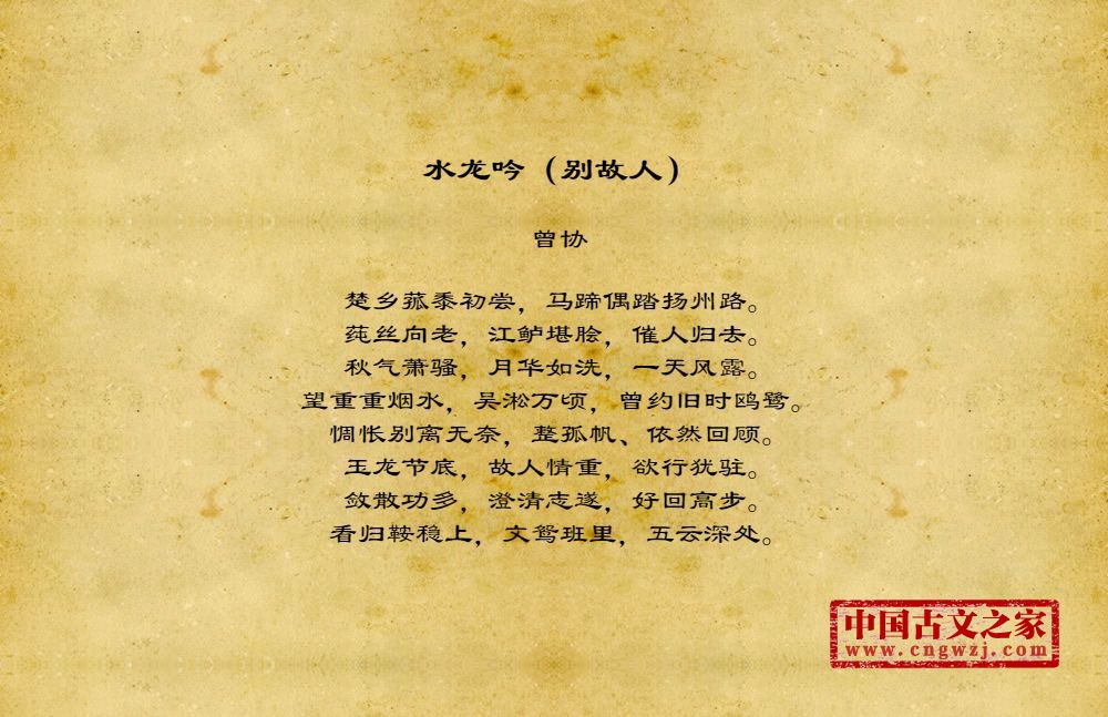 楚乡菰黍初尝,马蹄偶踏扬州路。莼丝向老,江鲈堪脍,催人归去。秋气萧骚,月华如洗,一天风露。望重重烟水,吴淞万顷,曾约旧时鸥鹭。惆怅别离无奈,整孤帆、依然回顾。玉龙节底,故人情重,欲行犹驻。敛散功多,澄清志遂,好回高步。看归鞍稳上,文鸳班里,五云深处。