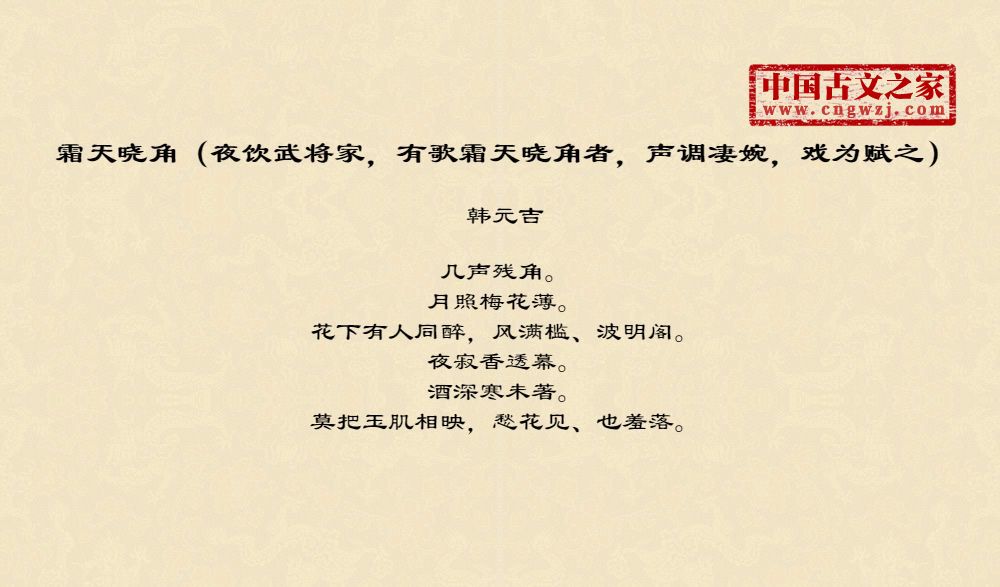 《霜天晓角(夜饮武将家,有歌霜天晓角者,声调凄婉,戏为赋之)》的原文打印版(韩元吉)