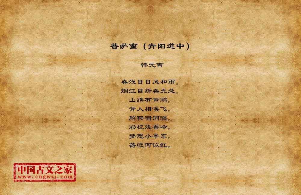 春残日日风和雨。烟江目断春无处。山路有黄鹂。背人相唤飞。解鞍宿酒醒。彩枕残香冷。梦想小亭东。蔷薇何似红。