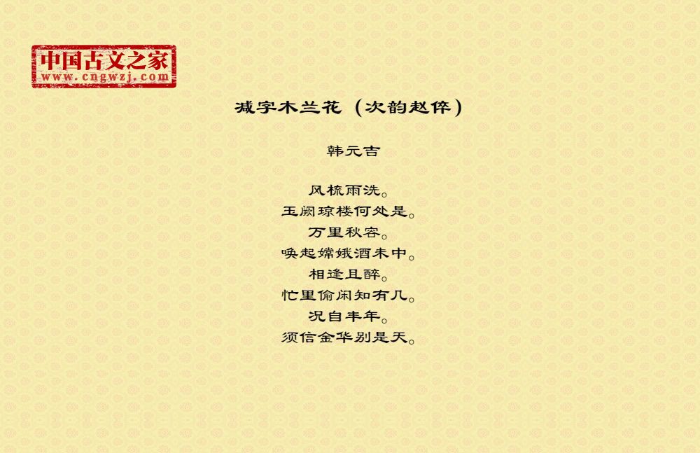 韩元吉(1118~1187),南宋词人。字无咎,号南涧。汉族,开封雍邱(今河南开封市)人,一作许昌(今属河南)人。韩元吉词多抒发山林情趣,如〔柳梢青〕