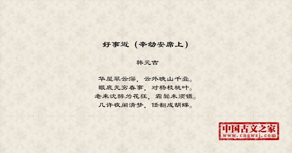 华屋翠云深,云外晚山千叠。眼底无穷春事,对杨枝桃叶。老来沈醉为花狂,霜鬓未须镊。几许夜阑清梦,任翻成胡蝶。