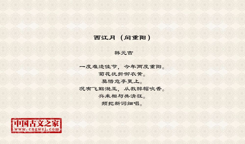 一度难逢佳节,今年两度重阳。菊花犹折御衣黄。莫惜危亭更上。况有飞觞滟玉,从教醉帽吹香。兴来相与共清狂。频把新词细唱。