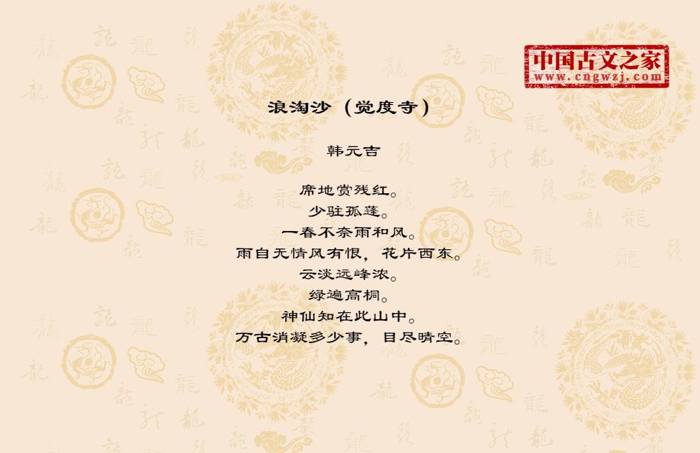 席地赏残红。少驻孤蓬。一春不奈雨和风。雨自无情风有恨,花片西东。云淡远峰浓。绿遍高桐。神仙知在此山中。万古消凝多少事,目尽晴空。