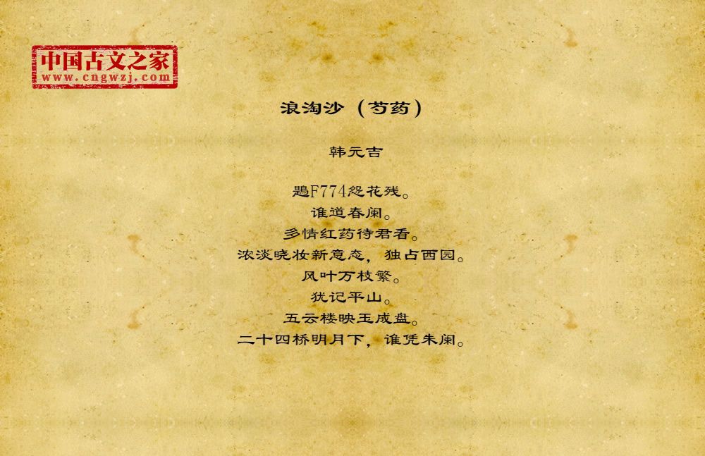 鶗F774怨花残。谁道春阑。多情红药待君看。浓淡晓妆新意态,独占西园。风叶万枝繁。犹记平山。五云楼映玉成盘。二十四桥明月下,谁凭朱阑。