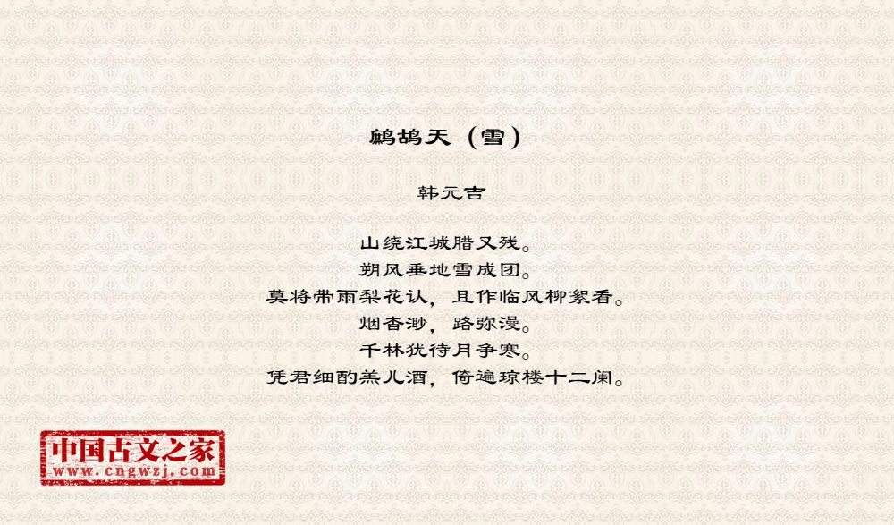 山绕江城腊又残。朔风垂地雪成团。莫将带雨梨花认,且作临风柳絮看。烟杳渺,路弥漫。千林犹待月争寒。凭君细酌羔儿酒,倚遍琼楼十二阑。