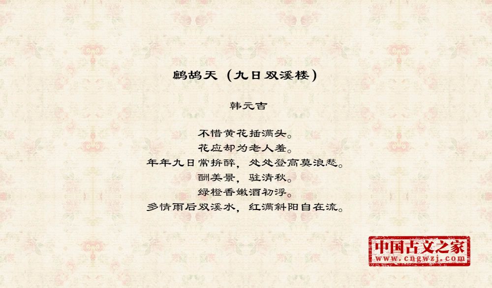 不惜黄花插满头。花应却为老人羞。年年九日常拚醉,处处登高莫浪愁。酬美景,驻清秋。绿橙香嫩酒初浮。多情雨后双溪水,红满斜阳自在流。