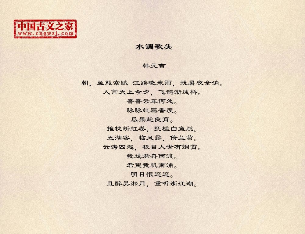 朝,至能索赋 江路晓来雨,残暑夜全消。人言天上今夕,飞鹊渐成桥。杳杳云车何处。脉脉红蕖香度。瓜果趁良宵。推枕断虹卷,抚槛白鱼跳。五湖客,临风露,倚兰苕。云涛四起,极目人世有烟霄。我送君舟西渡。君望我帆南浦。明日恨迢迢。且醉吴淞月,重听浙江潮。